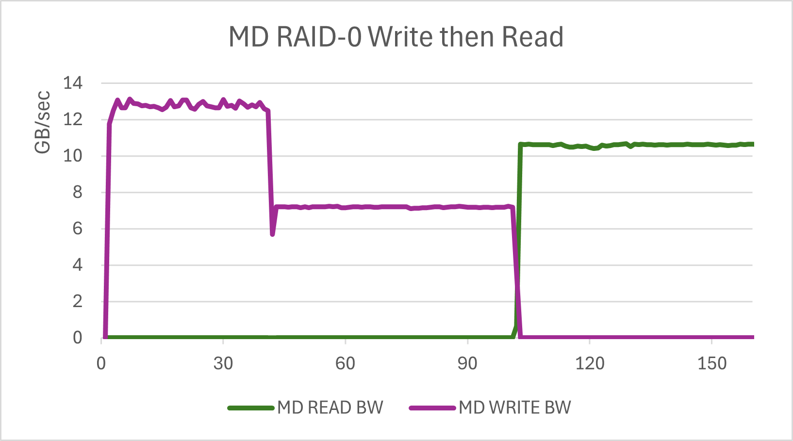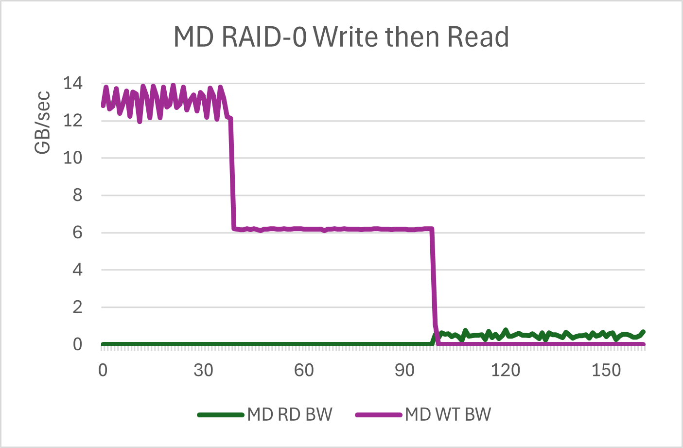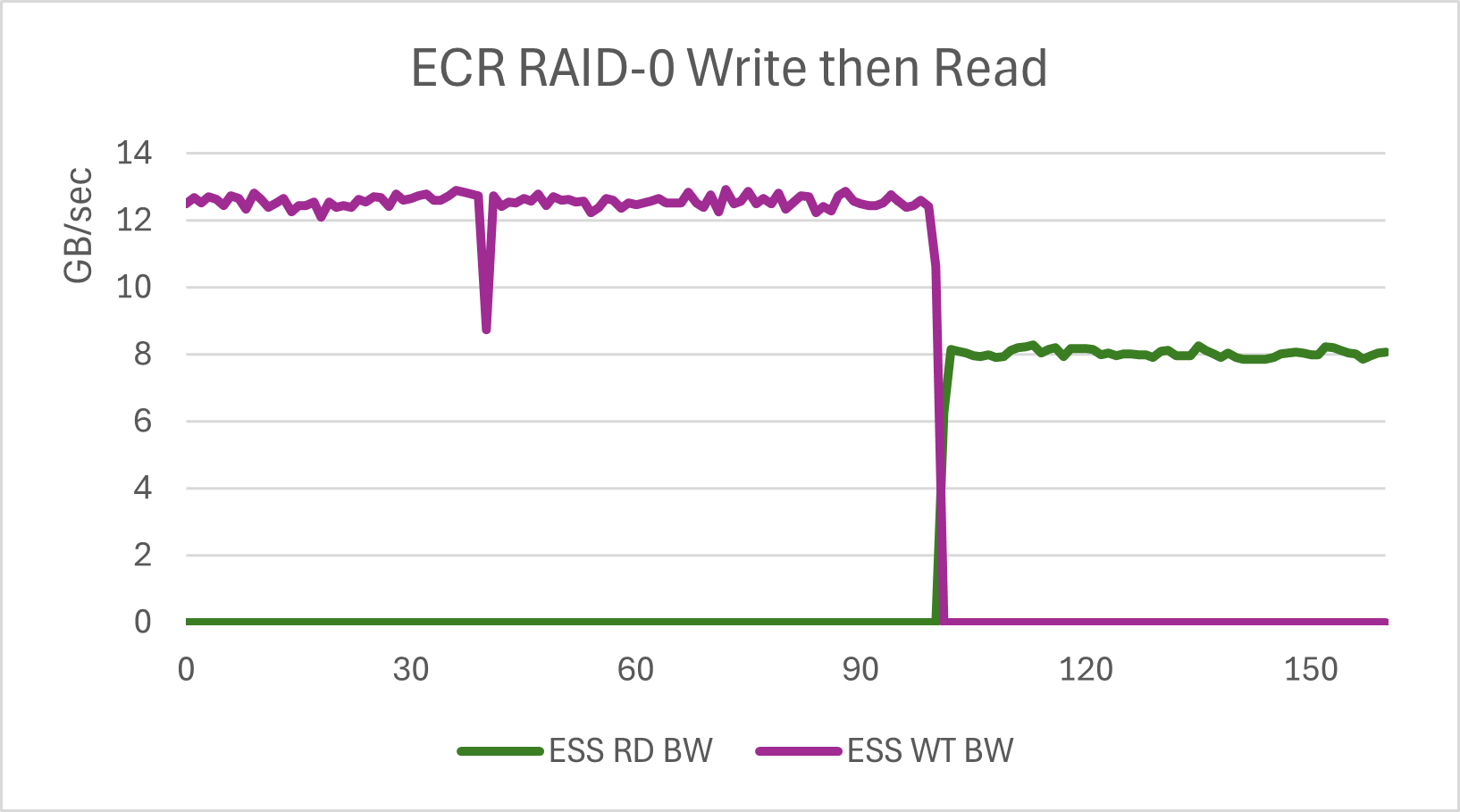 Here is the IO bandwidth graph of the ESS/RAID-0 test. Vertical units are GB/sec. The horizontal scale is time in seconds. Each third of the graph is the initial linear fill, the 16K random writes, and then the 16K random reads. It is somewhat hard to see the transition from linear to random writes. This is a feature of ESS. Up to a point, writes tend to run at the speed of the media, regardless of block size.